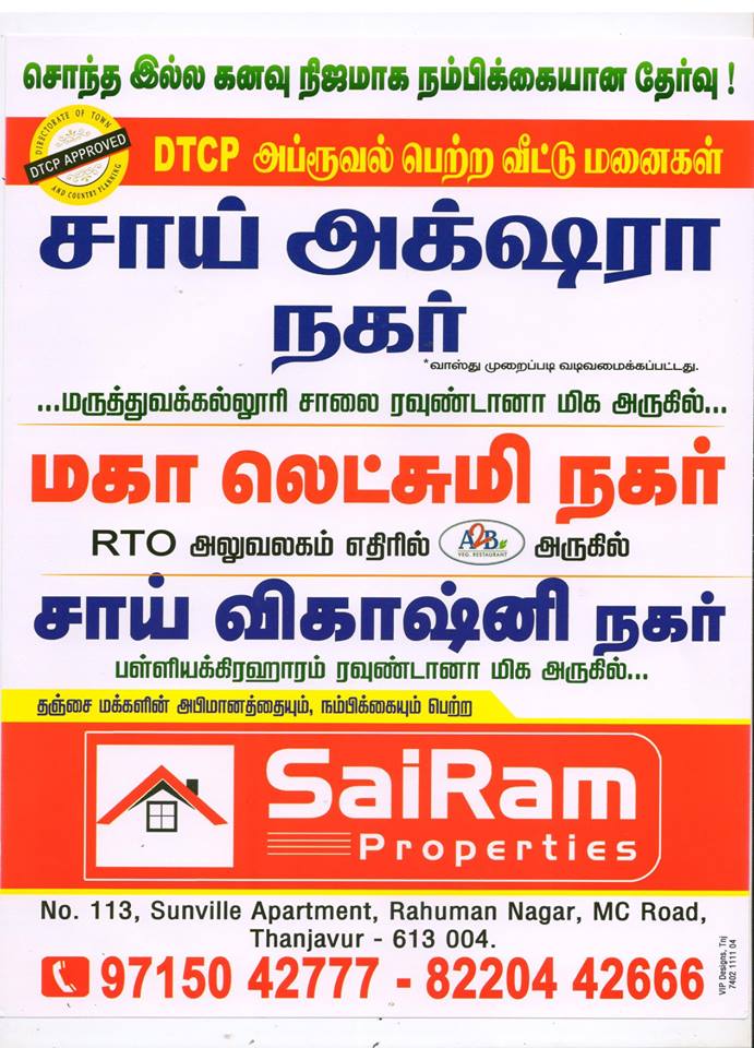 We are selling lands and houses near Sai Vikashini Nagar Thanjavur.